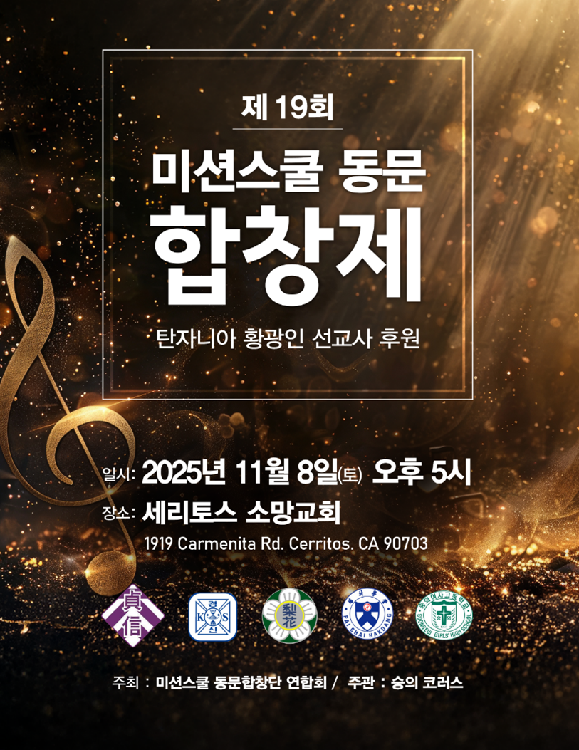 세리토스 소망교회(1919 Carmenita Rd., Cerriotos)에서 개최되는 이번 음악회는 순번에 따라 숭의여고 동문합창단인 숭의코러스(단장 장혜숙 권사)가 주관하고 미션스쿨동문합창단 연합회가 주최한다.
