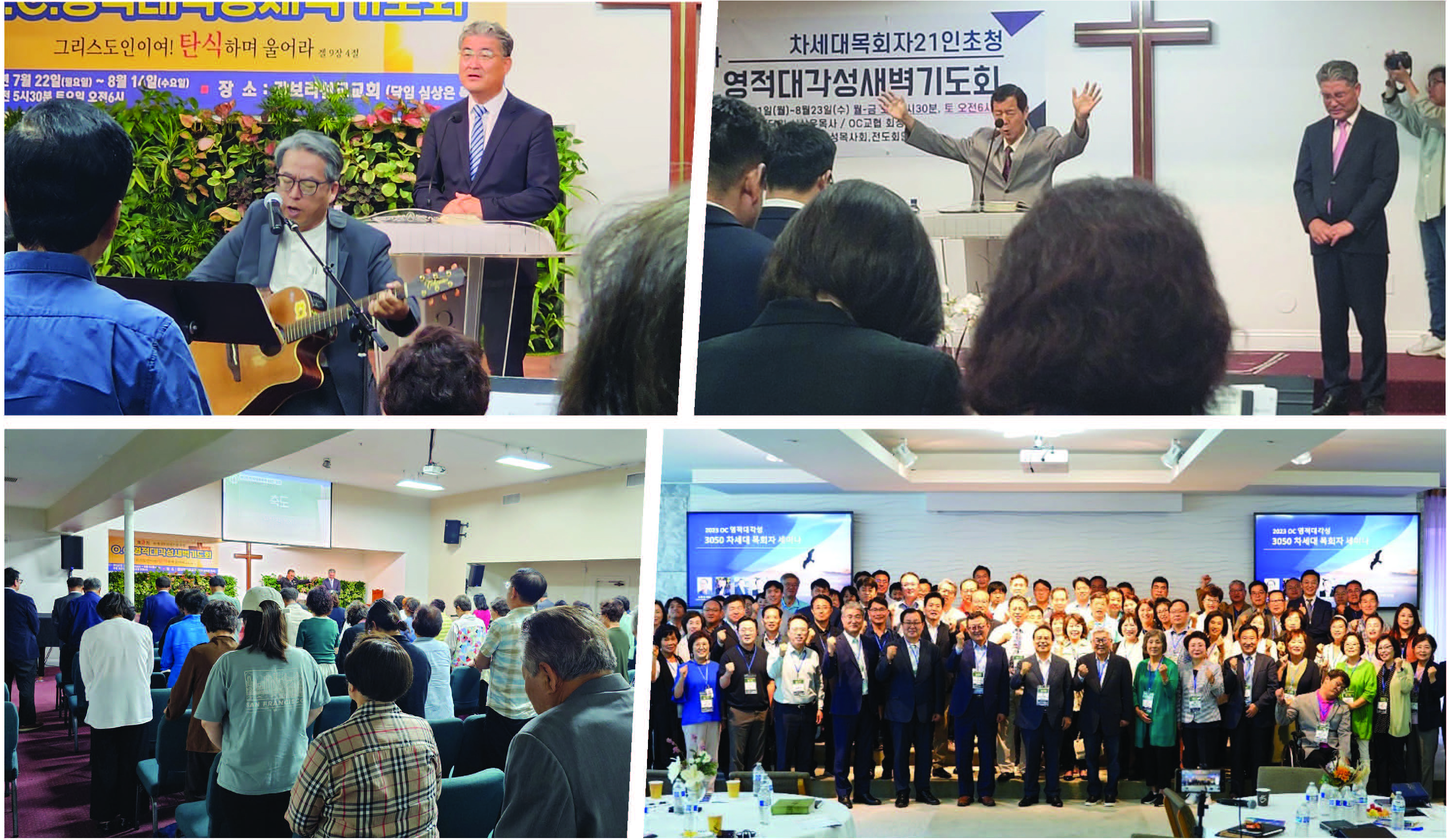 21일간 진행되는 영적대각성 새벽기도회에스 이원석목사(OC목사회 회장)가 찬양을 인도하고 있다. (왼쪽 위), 21일동안 21명의 차세대목회자가 매일 인도하는 새벽기도회는 주중에는 새벽5시30분부터, 토요일은 6시에 시작한다. 백여명의 참석자들은 말씀을 받은 후 나라와 민족, 교계와 지역사회를 위해 함께 기도한 후 매일 다른 메뉴로 마련되는 따뜻한 조찬을 나누고 헤어진다(오른쪽 위), 월-금 새벽 5시30분, 토요일 6시에 21일간 진행되는 새벽기도회에는 매일 100여명 이상의 성도들이 모여들어 21인 차세대목회자들의 말씀도전과 기도제목을 놓고 눈물로 기도한다. (왼쪽 아래), 1일간의 새벽기도회를 마친 뒤, 마지막 날에는 1차, 2차, 3차의 강사들과 지역 목회자들 120여명이 참석하는 목회자 세미나가 열린다. 올헤 강사는 한기홍목사, 김영길목사, 권혁빈 목사등이 나선다. 사진은 지난해 2023년 목회자 세미나를 마치고 기념촬영