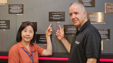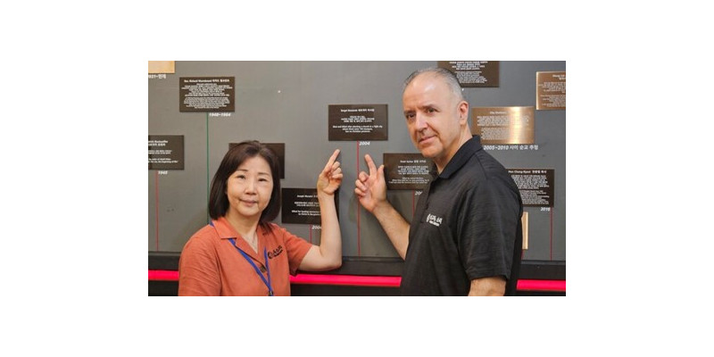 현숙 폴리 VOMK 대표(왼쪽)과 에릭 폴리 최고경영자가 순교자 연대표에 부착된 세르게이 목사의 명패를 가르키고 있다. ⓒ데일리굿뉴스