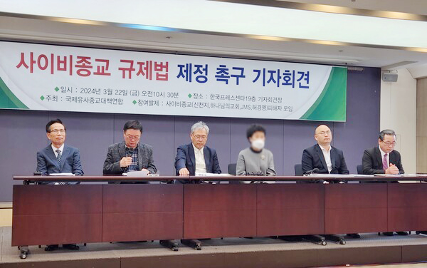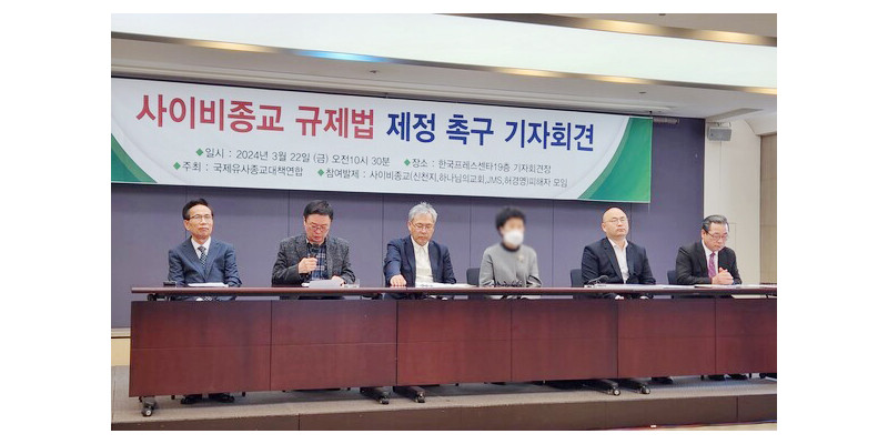 이날 국제유사종교대책연합(유대연·진용식 이사장)은 '사이비종교 규제법 제정 촉구 기자회견'을 열어 사이비종교의 피해상황을 알리고 국가 차원에서 사이비종교를 규제해야 하는 당위성을 설파했다.