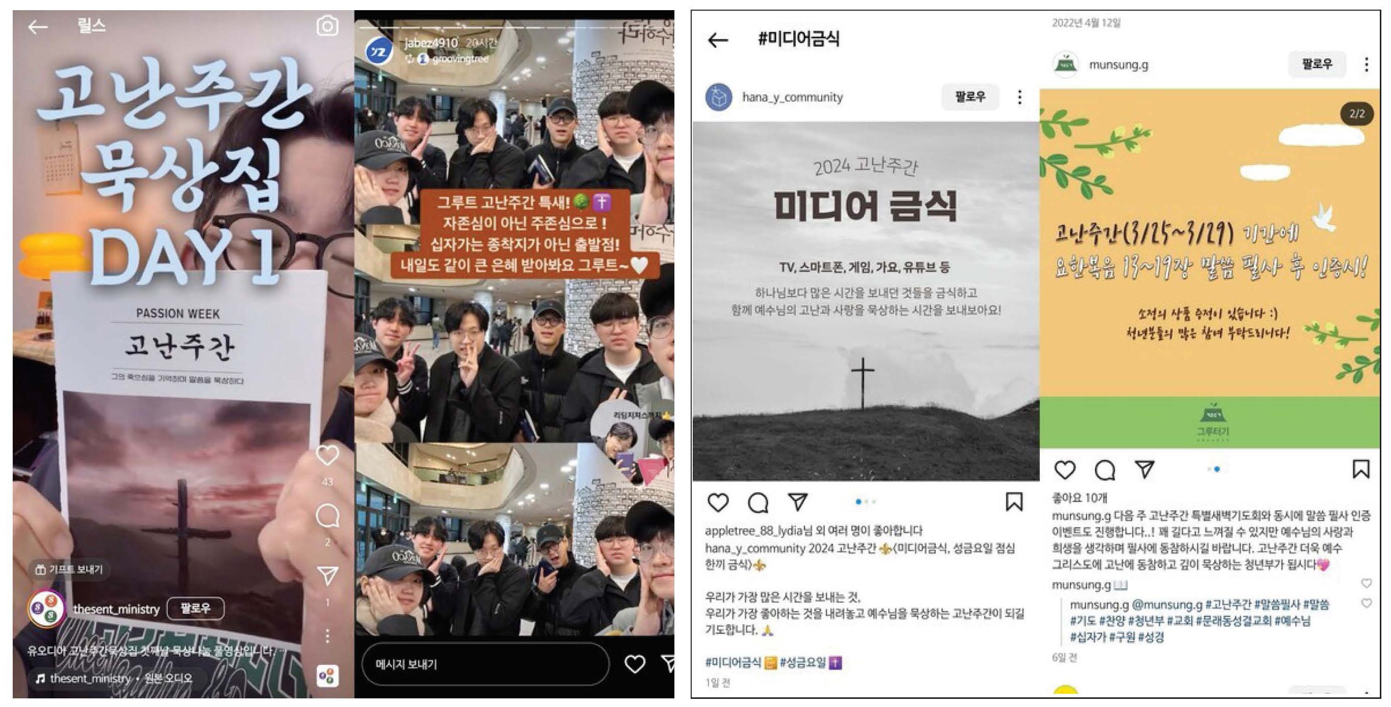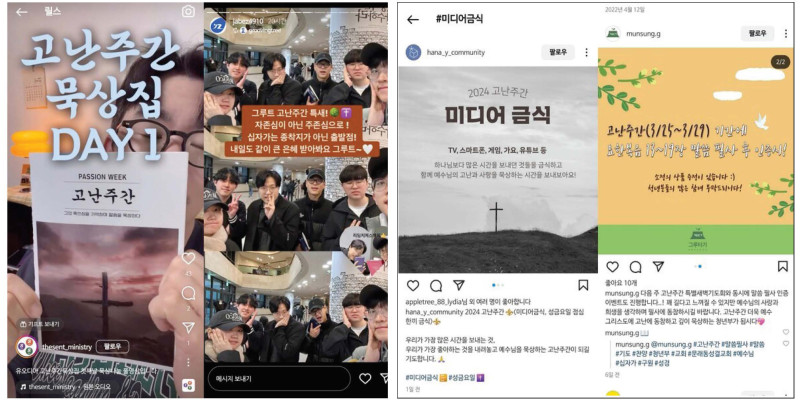 고난주간에 동참하는 청년들에 모습(왼쪽), 챌린지 문화 확산과 함께 SNS에는 각종 인증 게시물이 올라오고 있다.     (사진 = 인스타그램 갈무리)