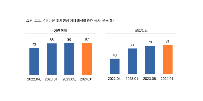 코로나19 엔데믹 선언 후 1년, 주일 현장 예배가 코로나 이전 대비 87% 회복되고 예배 외 활동은 팬데믹 이전 수준 이상으로 회복된 것으로 나타났다.