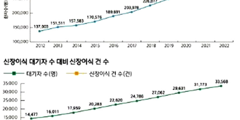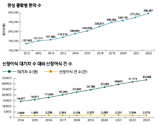 만성 콩팥병 환자 중 신장이식을 대기하고 있는 환자는 2023년 말 기준 3만 3,568명이다. 하지만 국립장기조직혈액관리원에 따르면 이들 중 약 6%인 2,070명만이 지난해 신장이식을 받았다. 신장이식 대기환자는 매해 2,000여 명씩 증가하고 있지만, 기증인은 비슷한 수준으로 2021년 환자들의 평균 대기기간은 1,905일에 이른다.