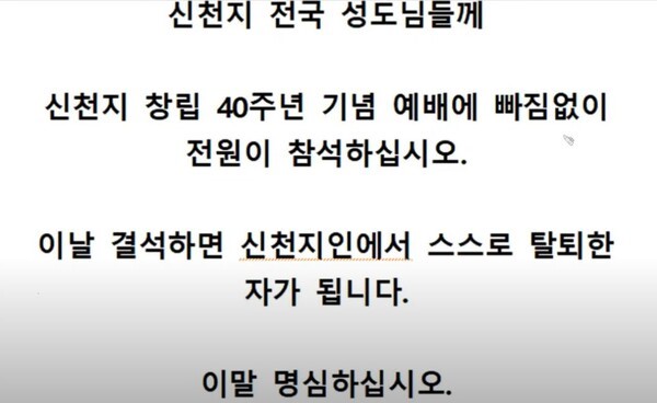 신천지는 지난 1일자 이만희 교주 명의의 서신에서 "신천지 창립 40주년 기념 예배에 빠짐없이 참석하라"며 "이날 결석하면 신천지인에서 스스로 탈퇴한 자가 된다"고 공지했다.