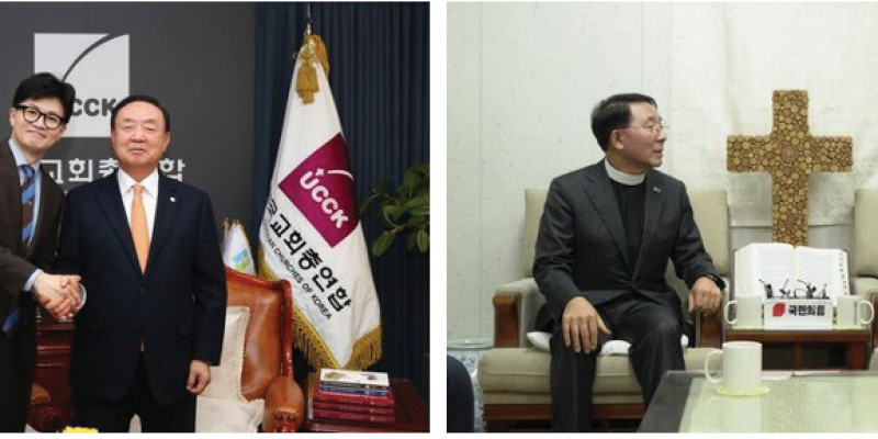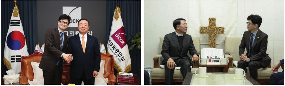 국민의힘 한동훈 비상대책위원장(좌)과 한교총 장종현 대표회장이 회담에 앞서 기념촬영을 하고 있다.(사진= 한교총)-왼쪽사진, NCCK 김종생 총무(좌)와 한동훈 비대위원장이 면담을 하고 있다.(사진=NCCK)