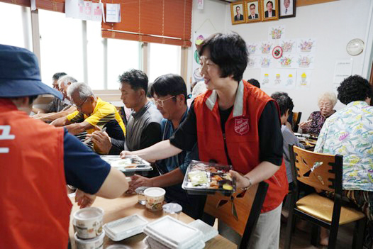 구세군 자원봉사자가 충남 예산에서 수재민에게 식사를 제공하고 있다.(구세군 제공)