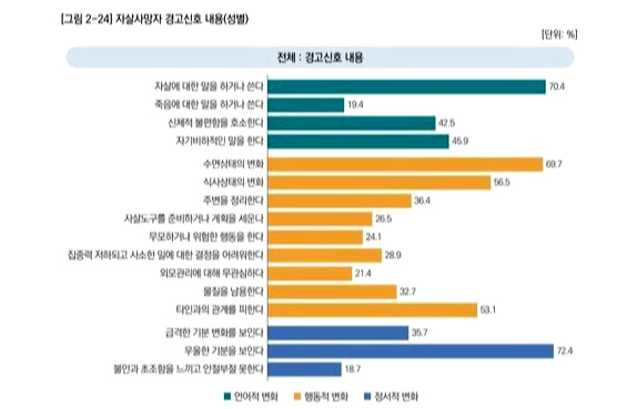 자살 위험 신호는 ▲언어적 ▲행동적 ▲정서적 징후로 구분된다. 언어적 징후는 '죽고 싶다', '죽어야 편해질 것 같다' 등 직접적인 표현에서부터 '희망이 없다', '내가 없어지는 게 낫다' 같은 자기비하나 절망감으로 드러난다. 실제 조사에서 '자살에 대한 말을 하거나 쓴다'(70.4%), '자기비하적 표현을 사용한다'(45.9%)가 주요 징후로 나타났다.