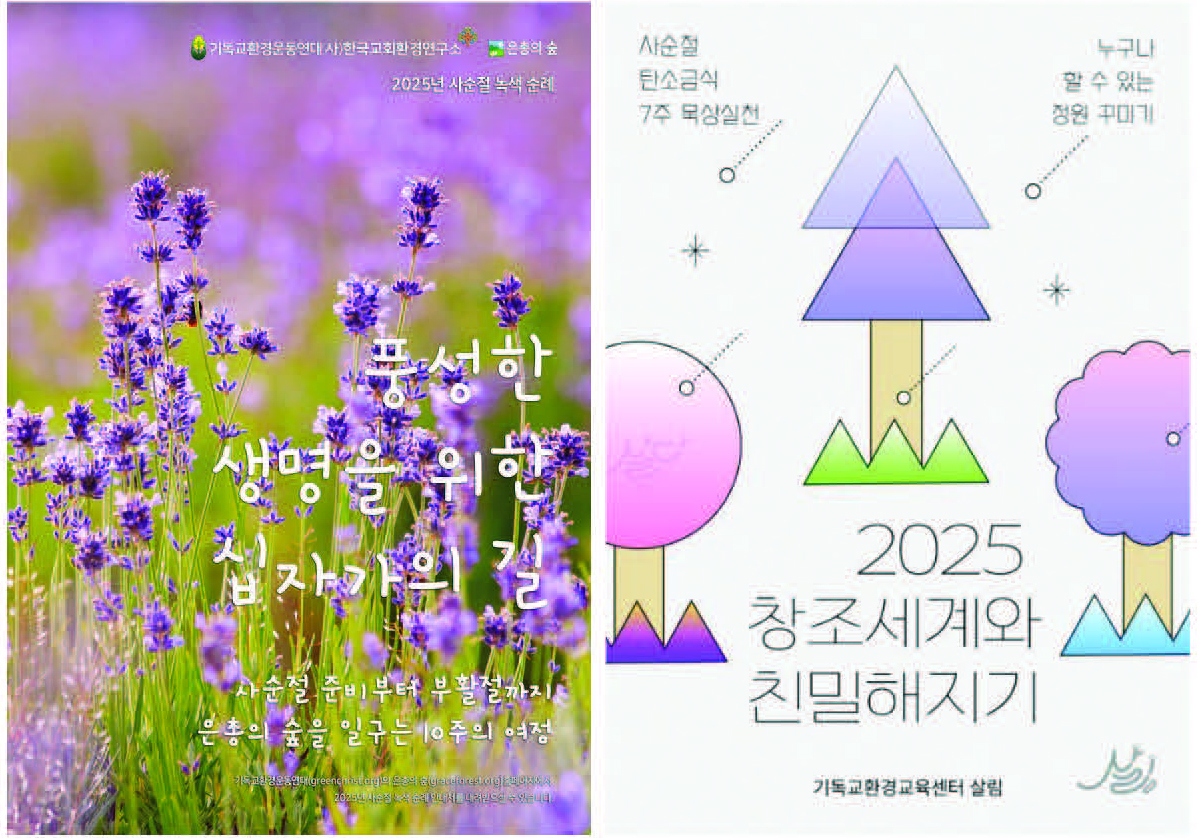 기독교환경운동연대와 한국교회환경연구소 은총의숲센터는 사순절을 앞두고 '2025년 사순절 녹색 순례: 풍성한 생명을 위한 십자가의 길' 프로그램을 선보였다. 이 프로그램은 교회가 기도와 금식을 통해 창조 세계 회복에 동참할 수 있도록 10주 과정으로 구성돼 있다. 사순절 기간을 '초대, 잔치, 맺음, 새김'으로 구분해 각 단계에 의미를 부여하고, 주별로 성경 말씀을 함께 제시했다.