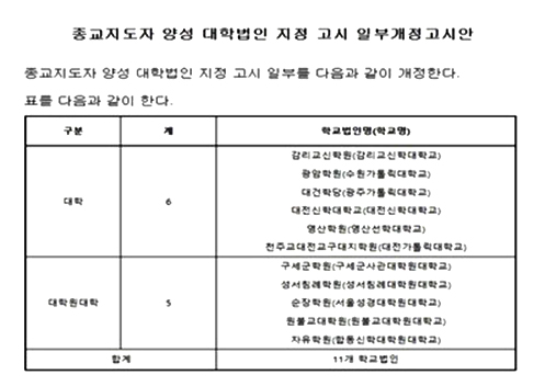 교육부는 지난달 14일 '종교지도자 양성 대학법인 지정 고시' 개정안을 행정예고했다. 2008년 이후 폐교와 학과 개편 등을 반영해 명단을 현행화하기 위한 목적이라고 밝혔다.