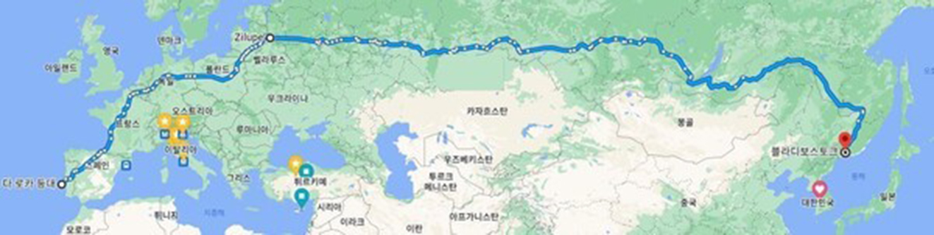 이 씨의 여행경로는 포르투갈(카보 다 로카)-스페인-프랑스-독일-폴란드-리투아니아-라트비아-러시아(모스크바-카잔-예카데린브르크-투먼-옴스크-노보시비르스크-크라스노야르스크-이르쿠츠크-울란우데-치타-하바로프스크-블라디보스토크) 으로 8개국이며 거리만도 1만 5,000km에 육박한다.