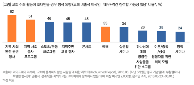 반면 예배(35%)·신앙 소그룹(26%)‧영적 세미나(24%) 등 직접적인 종교 활동은 상대적으로 낮은 응답을 보였다. 이는 종교적 메시지보다 지역 사회를 위한 실천 중심의 접근이 초대의 문을 여는 데 더 효과적임을 말해준다.