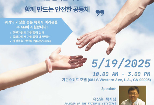KFAM(한인가정상담소·소장 캐서린 염)은 오는 5 월 19 일(월), LA 가든스위트 호텔에서 제 6 회 가정폭력예방 목회자 컨퍼런스를 개최한다.  이번 컨퍼런스는 “가정을 살리는 목회, 교회를 살리는 가정 – 함께 만드는 안전한 공동체”를 주제로, 한인 커뮤니티 안에서 가정폭력 문제를 신앙 공동체가 어떻게 이해하고 대응할 수 있는지 함께 고민하고 배우는 자리다. 목회자뿐만 아니라 신학생, 전도사, 목회자 사모 등 사역에 관심 있는 누구나 참여 가능하다. 행사는 오전 10 시부터 오후 3 시까지 진행되며, 등록비는 무료, 사전 등록자에게는 점심식사가 제공된다. 메인 강연자로는 “유상훈 목사(The Faithful City 설립자, AZTIFC)가 초청되어, 사회복지학 석사(MSW) 및 목회학 박사(D.Min) 학위를 바탕으로 가정폭력의 실제 사례와 교회 내 대처 방안, 그리고 피해자 지원을 위한 유용한 리소스를 공유할 예정이다. KFAM 의 소장 캐서린 염은 “신앙 공동체 안에서 조용히 아픔을 감내하는 이들이 있다. 그 분들에게 먼저 다가가 손을 내밀 수 있는 분들이 사역자들이며, 이번 컨퍼런스가 그런 따뜻한 연결의 시작점이 되길 바란다”라고 전했다.  등록 마감은 5 월 5 일(일)까지이며, 아래 링크를 통해 신청할 수 있다.  등록링크: https://forms.gle/dd4GwDA48ZooTbAE6 문의: 강유미 213-600-7310 / ykang@kfamla.org