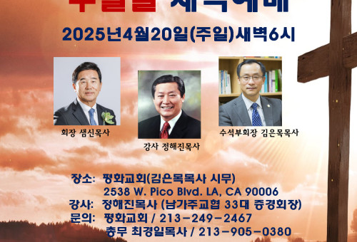 남교협(회장 샘신목사), 2025 부활절새벽예배가 LA지역 교회들과 함께 연합으로 드려진다. 남교협은 LA 지역 교회들 중에 부활절새벽예배를 드리지 않는 교회와 성도들이 한 자리에 모여 죽음을 이기고 부활하신 예수 그리스도를 맞이하며 드리는 새벽예배는 오래전부터 성도들과 교회들의 전통이었음을 상기하고 인근 지역 목회자들과 성도들을 초대한다고 밝혔다. 이번 예배는 그동안 LA산불로 큰 피해를 입은 지역 주민들에게 희망과 위로를 전달하는 자리가 될 것이라는 기대와 함께 드려진다. 예배 장소는 수석부회장 김은목목사가 시무하는 평화교회 ( 2538 W Pico Blvd, Los Angeles ) 에서 진행되며 말씀은 남가주교협 33대 증경회장인 정해진 목사가 맡는다. 예배 관련 문의는 남교협 총무 최경일목사(213)905-0380 으로 연락하면 된다.  [이 게시물은 크리스천헤럴드님에 의해 2025-04-13 21:12:15 오피니언에서 이동 됨]