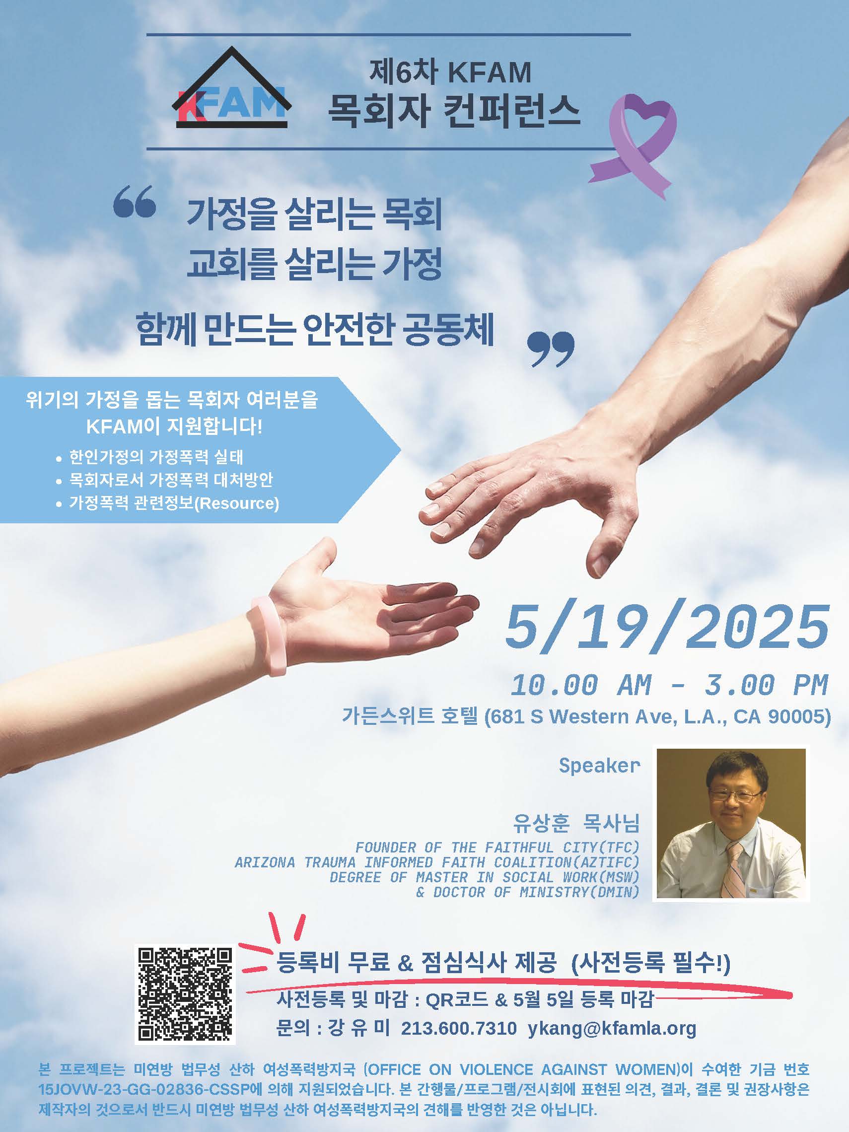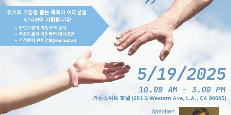 KFAM(한인가정상담소·소장 캐서린 염)은 오는 5 월 19 일(월), LA 가든스위트 호텔에서 제 6 회 가정폭력예방 목회자 컨퍼런스를 개최한다.
