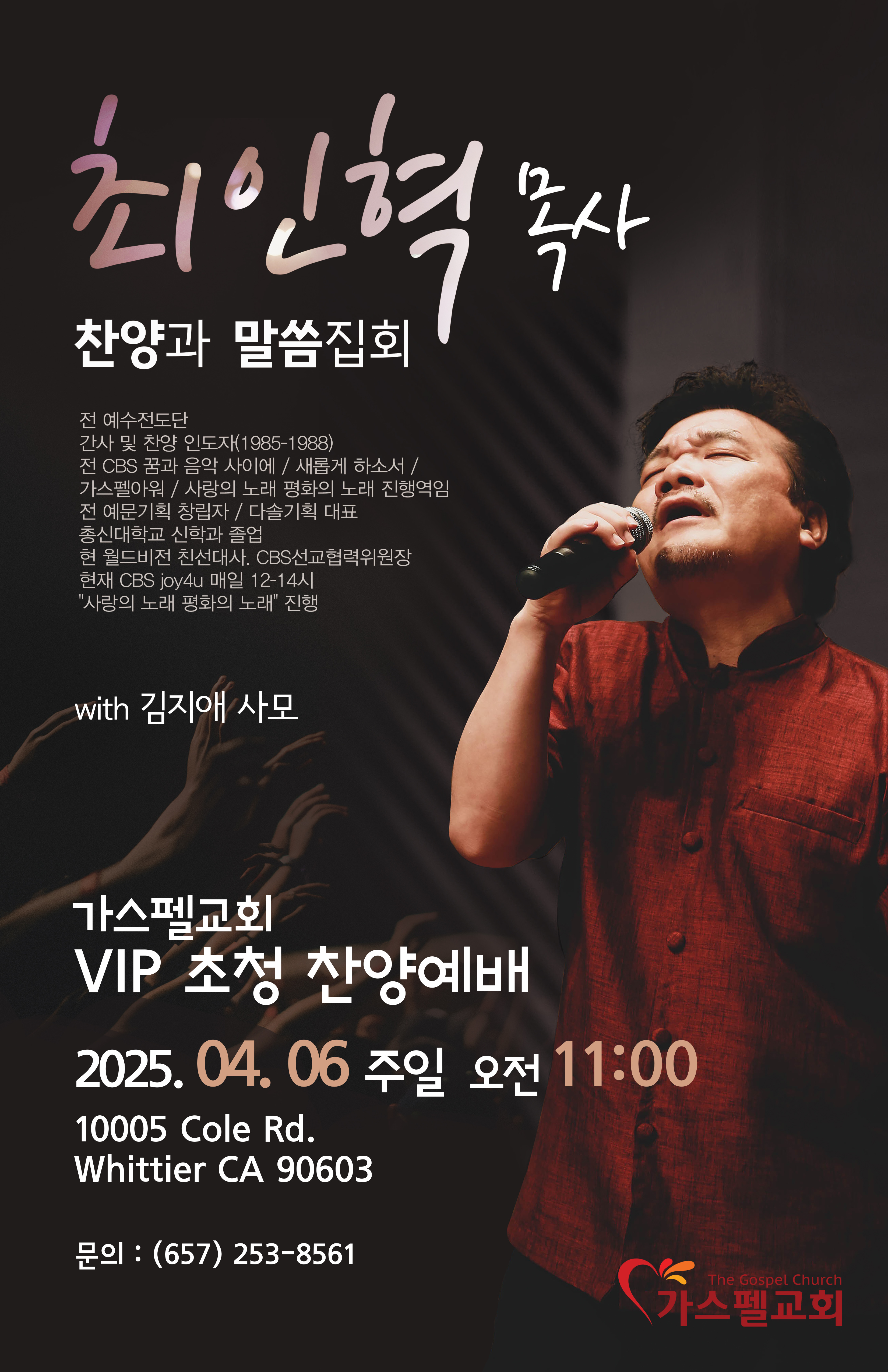 라미라다 지역에 위치한 가스펠교회(김정호 목사 담임)이 다가오는 2025년 4월6일 주일 오전 11시, 한국 찬양사역자 최인혁 목사 초청 찬양예배를 개최한다고 밝혔다.