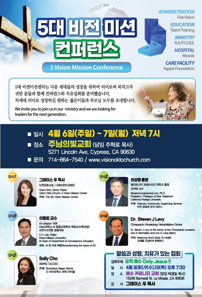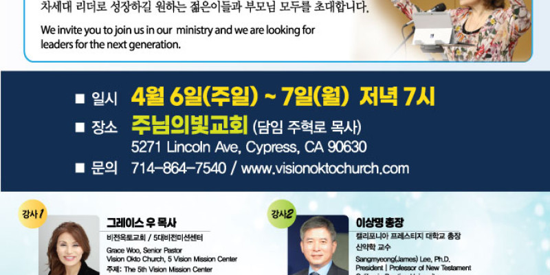 4월6일과 7일 컨퍼런스는 ▲그레이스 우목사의 (비전옥토교회 담임-5대 비전 센터) ▲이상명 총장(캘리포니아 프레스티지 대학교 총장-비전