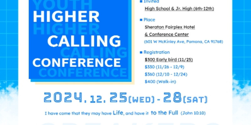 매년 12월이면 개최되는 미주청소년수련회(Youth Higher Calling Conference)가 올해도 다가오는 12월 25일(수)부터 28일(토)까지 포모나 소재 Sheraton Fairplex Hotel에서 개최될 예정이다.