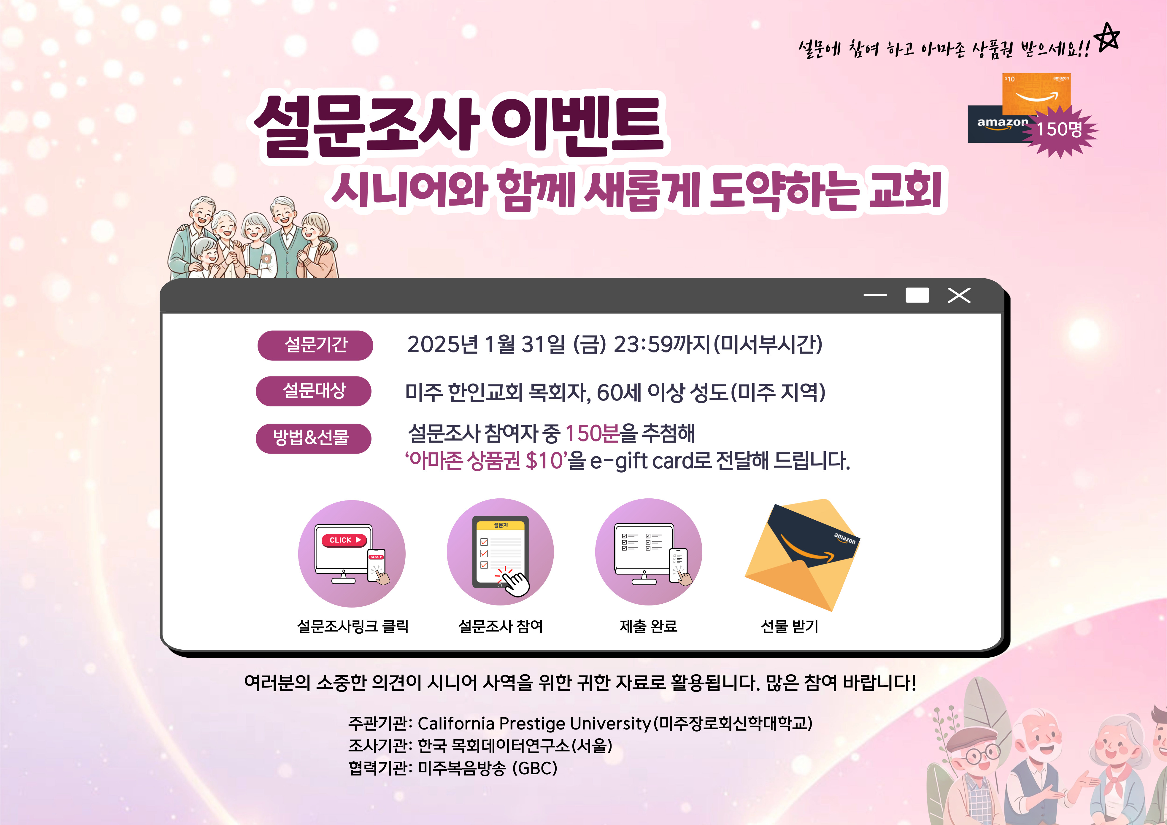PULI(프레스티지 대학 평생교육원)의 이성희 원장은 “설문에 대한 성실한 답변 하나하나가 미주 한인교회 시니어 사역 준비를 위한 소중한 통계자료로 이어지므로 목회자들과 시니어 성도들의 적극적인 참여를 바란다”라고 요청했다. 또한, “섬기는 교회의 시니어 성도들에게 설문조사가 있음을 안내하고 참여하도록 돕는 목회자에게는 $10 상당의 아마존 상품권이 증정됩니다. 그리고, 설문을 완료한 분들에게 감사의 의미로 추첨을 통해 150명에게 $10 상당의 아마존 상품권이 e-gift card로 증정된다”라고 밝혔다.