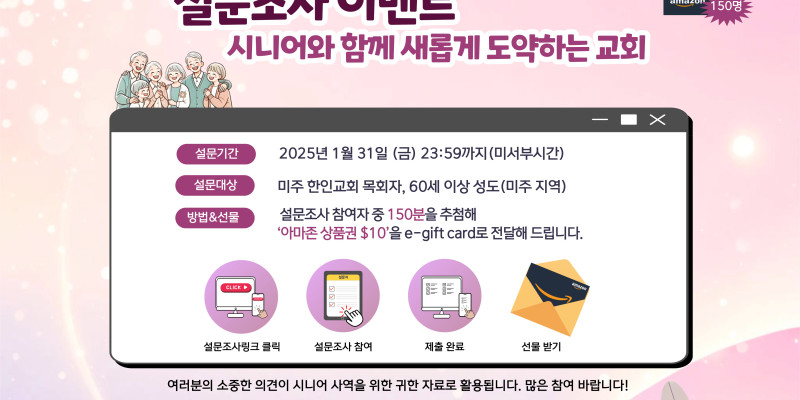 미국 전 지역의 목회자 또는 60세 이상의 성도들을 대상으로 진행되는 본 조사는 설문 링크가 이메일이나 문자, 카카오톡의 메시지로 발송되어 누구나 간편하게 참여할 수 있으며 2025년 1월 말까지 실시할 예정이다.