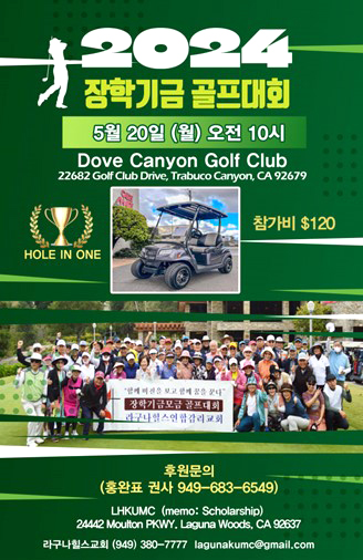 한편, 장학기금모금을 위한 제 12회 장학기금 골프대회가 5월 20일(월) 오전 10시에 Dove Canyon golf Club에서 열린다. 골프대회 참가 신청이나 후원은 라구나힐스교회로 연락을 하면 된다.