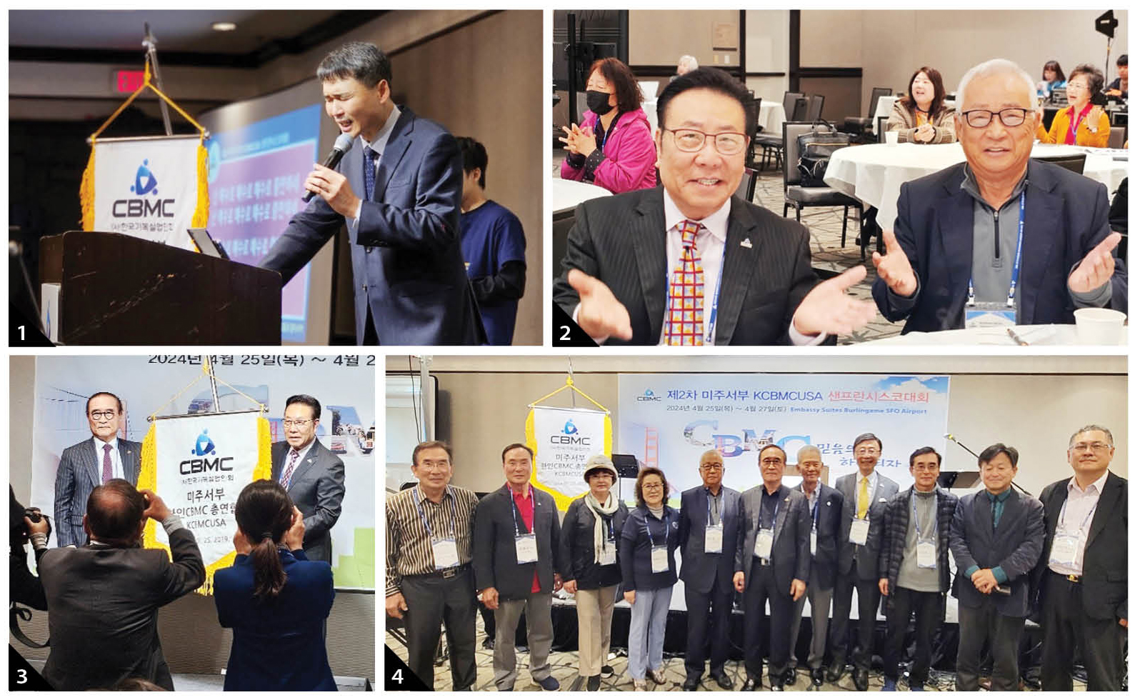1. 주강사로 초대된 최혁목사(주안에교회 시무)가 말씀을 마치고 함께 기도하고 있다. 2. 이번 대회의 주역인 CBMC미서부 총연합회 강승태회장과 직전회장인 황선철장로가 행사중 나란히 앉아 찬양하고 있다. 3. 한국중앙회 최범철 회장(왼쪽)이 미서부총연합회 현 회장인 강승태 회장에게 미주서부연합회에 본부 깃발을 전달하고 있다. 4. 이번 대회에 참석한 남가주 지회 회원들, 왼쪽부터 최순길목사, 이봉우 남가주연합회 회장, 가든그로브지회 윤우경 부회장, 부에나파크지회 최예나 지회장, 미주서부총연합회 황선철 직전총회장, 한국중항회 최범철회장, 맨 오른쪽이 남가주 지도위원인 안신기목사