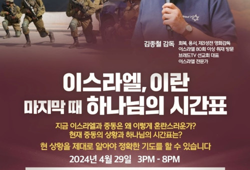 중동정세가 심상치 않은 가운데 OC목사회(회장 이원석목사)가 이스라엘에서 사역중인 김종철감독을 초청, 이스라엘 중동 제대로 알기 특강을 개최해서 주목된다. 이원석목사는 본 세미나를 통해서 성경적 관점에서 현재의 중동 현실과 이스라엘에 대해 제대로 살펴볼 수 있는 좋은 시간이 될 것이라며 기대감을 드러냈다. 이번 세미나 주제는 ‘이스라엘, 이란.. 마지막때 하나님의 시간표’ 로 이스라엘과 중동은 왜 이렇게 혼란스러운가? 현재 중동의 상황과 하나님의 시간표는? 등이 포함 되며 현 상황을 제대로 알아야 정확한 기도를 할 수 있음을 강조하게 된다.   총 4강의로 1강은 중동은 왜 만낼 시끄러운가? 2강은 이-팔, 평화롭게 살 수는 없을까? 3강 거짓말의 종교 이슬람과 하마스, 4강 지금 이스라엘과 하나님의 시간표 로 진행된다. 김종철감독은 회복, 용서, 제3성전 등을 제작한 영화감독으로 이스라엘을 80회 이상 취재방문했으며 현재 브래드TV선교회 대표인 이스라엘 전문가로 알려져있다. 일시는 4월29일 오후 3시부터 8시까지이고 장소는 갈보리선교교회(심상은목사 시무, 8700 Stanton Ave., Buena Park), 으로 OC목사회 주최, 효사랑선교회(대표 김영찬목사)가 협찬하며, Ahavat Elohim이스라엘기도회가 주관한다.