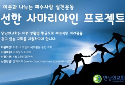 밸리에 소재한 만남의교회(담임 이정현 목사)가 '선한 사마리아인 프로젝트'를 통해 재정적 어려움에 처한 교회를 돕는다고 밝혔다. 팬데믹기간에 시작된 만남의교회의 나눔사역은 작년부터 만남의교회 13579캠페인에 따라 3대 절기(부활절, 추수감사주일, 성탄절) 헌금을 이웃과 나누는 예수사랑 실천운동으로 그 지경을 넓혔다.작년에 이어 올해도 부활절 헌금을 나눔으로, 미자립교회 또는 재정적으로 어려운 교회를 돕고자 신청을 받고 있다. 지원대상은 가주 내 모범적 목회활동 중인 교회로 교회당 1천불이 지원된다. 신청기간은 4월 16일(화)까지이며 몇 개 교회를 섬기는지는 알려지지 않았다.  신청서는 만남의교회 홈페이지 www.churchmannam.com 에서 이웃과 나누는예수사랑 실천운동 배너를 클릭해서 작성하면 된다.