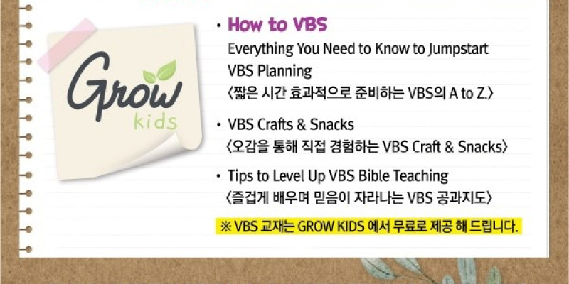 2024년 VBS 교제는 GROW Co. 후원으로 모든 교회에 무료 제공하는 여름성경학교 교재 등을 바탕으로 짧은시간에 효과적으로 준비할 수 있는 VBS의 A to Z, 오감을 통해 직접 경험하게 되는 크래프트와 스택 준비, 등 즐겁게 배우면서 경험할 수 있는 다양한 Craft & Activities Ideas등을 교회에 돌아가 곧장 적용해 사용할 수 있도록 3시간에 걸쳐 훈련한다.