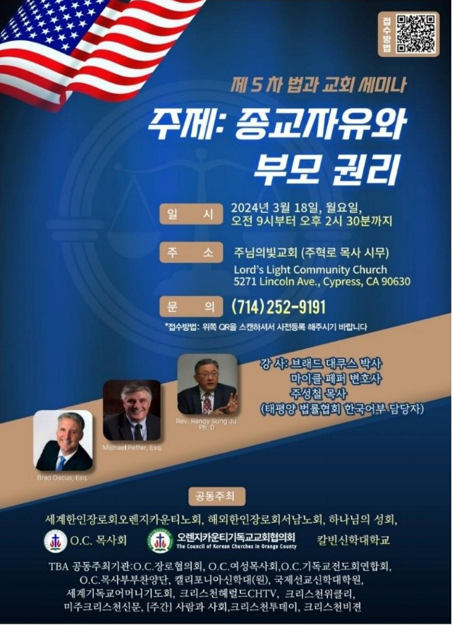 지난 26년 동안 종교 자유, 부모 권리, 생명의 존엄성을 지키기 위해 미전역에 큰 영향력을 끼쳐 오고 있는 태평양법률협회(이하 PJI)가 OC교계 기관들과 함께 종교자유와 부모권리 세미나를 개최한다.