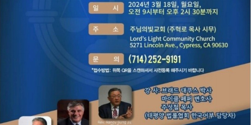 강사는 태평양법률협회의 유명 사역자인 브레드 대쿠스 박사와 마이클 페서 변호사, 그리고 한국어부 담당자로 활동하고 있는 주성철목사가 나서게 된다. 통역이 준비된다.