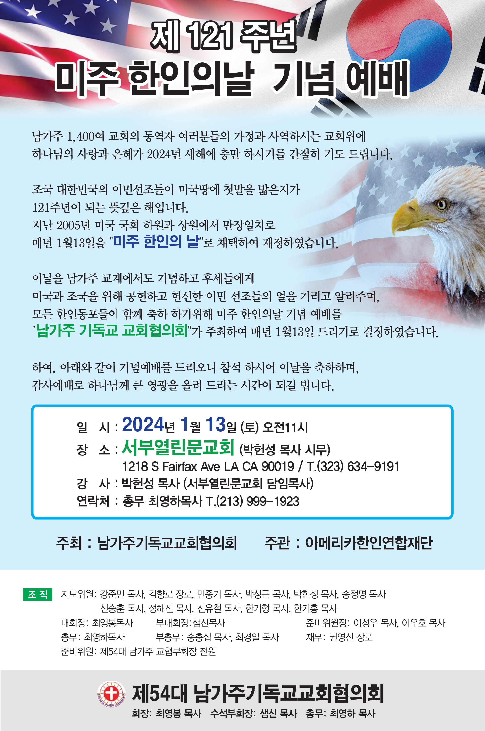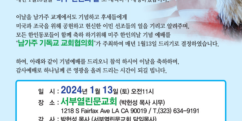 올해 미주한인의날 기념예배는 서부열린문교회(1218 S. Fairfax Ave, LA)이며 내년 1월13일 토요일 오전11시에 시작된다. 당일 메시지는 박헌성목사가 전하며 남교협 주최, 아메리카한인연합재단 (대표 이우호목사)주관으로 열린다. 이우호목사는 미주한인의날이 최초로 가주하원에 상정될 당시 공동발기인 중 1인으로 활동했다.