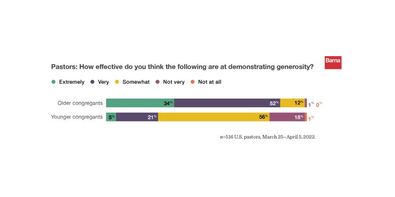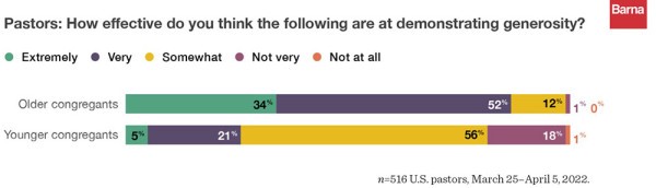 목사 3명 중 1명(34%)은 자기 교회의 나이 많은 성도들이 헌금을 매우 잘한다 생각한다. 그러나 젊은 성도들이 헌금을 '제대로 한다'는 이보다 7배나 낮은 5%를 보였다. 실제로, 목회자의 거의 대다수(56%)는 젊은 성도들이 헌금을 "어느 정도만" 한다고 생각한다. '헌금을 전혀하지 않는다'에 대해서는 목회자들은 나이 많은 성도의 12%가 전혀하지 않는다고 말하지만, 목회자 5명 중 1명(18%)은 젊은 세대들이 전혀 헌금하지 않는다고 응답했다.