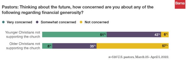 목회자들의 우려는 교인들의 기부에 의존하고 있는 현실적 문제로 현재 나이든 세대에 비해 경제적으로 덜 안정되고 교회 출석, 자선 기부 수준이 낮은 세대에 달려 있기 때문에 우려는 더 커진다. 목회자들은 미래에 교회에 재정적인 헌신을 할 것인가에 대해서는 젊은 세대는 교회를 지원하지 않을 것이라는 데에 대해서 매우 우려하다는 목회자다 51%, 다소 우려한다가 43%, 우려하지 않는다가 6%이며, 나이든 세대가 교회를 제정적으로 지원하지 않을 것이라는 것에 대해서는 8%만 매우 우려하고, 35%는 다소 우려하지만, 57%는 전혀 우려하지 않는다고 응답, 교회의 미래에 대한 젊은 세대 재정적 지원에 대해서 많은 목회자들이 상당히 우려하고 있음을 보여줬다.