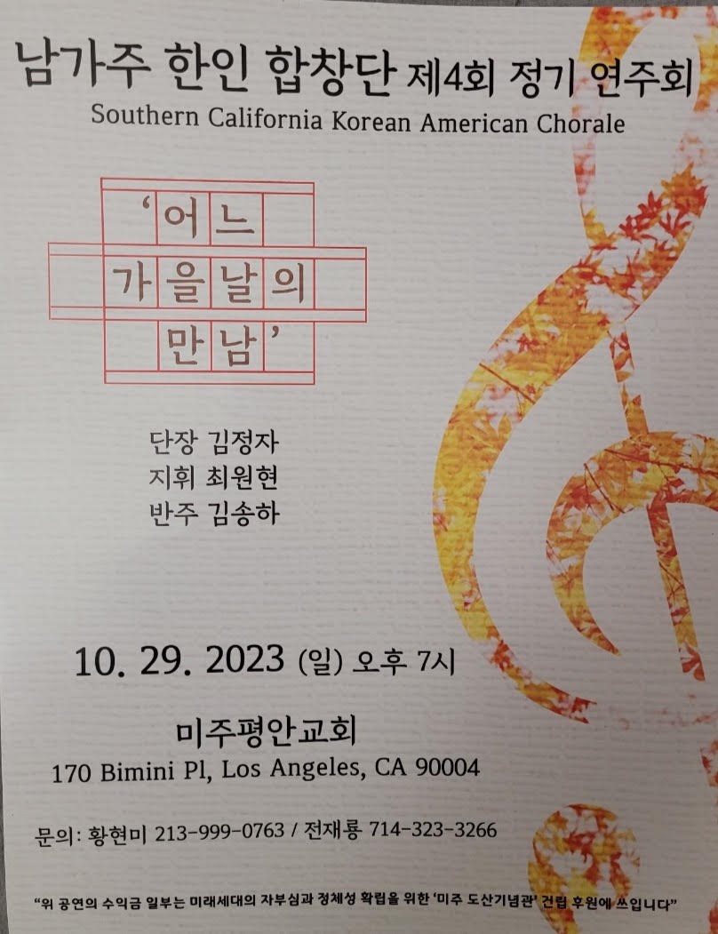 2014년에 창단된 남가주한인합창단 (단장: 김정자; 지휘: 최원현)이 오는 10월29일, 제4회 정기공연을 개최한다. 지난 3년간 전후후무한 코로나 사태와 팬데믹 기간동안 위축된 우리 모두가 주님이 주신 사랑을 외롭고, 소외되고, 힘든 이웃들에게 그 사랑을 전하는 자리를 만들기 위해 5명의 솔리스트와 40여명의 단원들이 최원현 지휘자, 김송하 반주자와 함께 마련하는 자리이다. 미주평안교회 (담임 임승진 목사)는 170 Bimini Place, Los Angeles, CA 90004 위치하며 오는 10월 29일 주일 오후 7시에 개최된다.