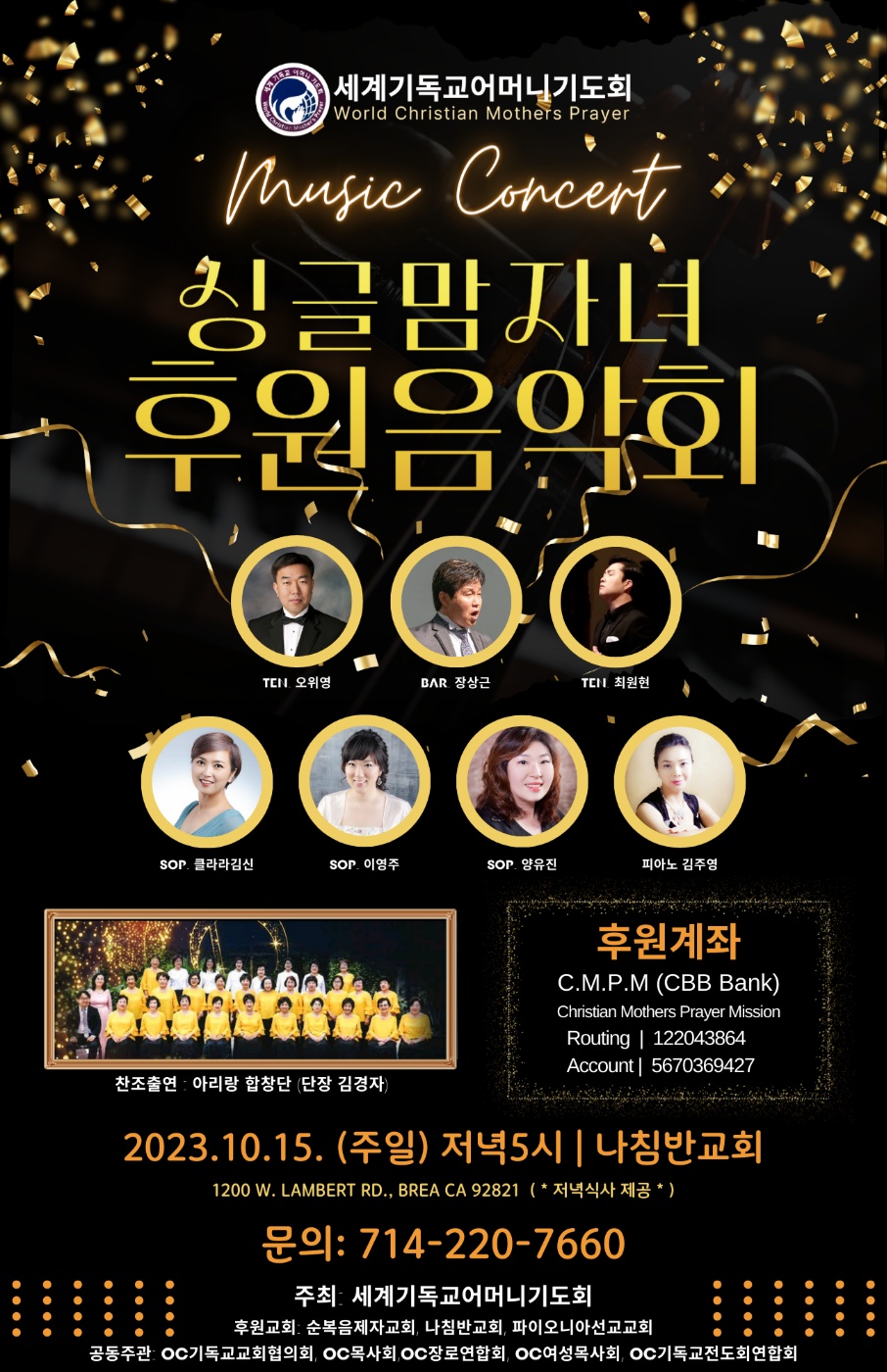 세계기독교어머니기도회가 다가오는 10월15일 주일저녁 5시에 나침반교회에서 싱글맘자녀 후원을 위한 음악회를 개최한다.