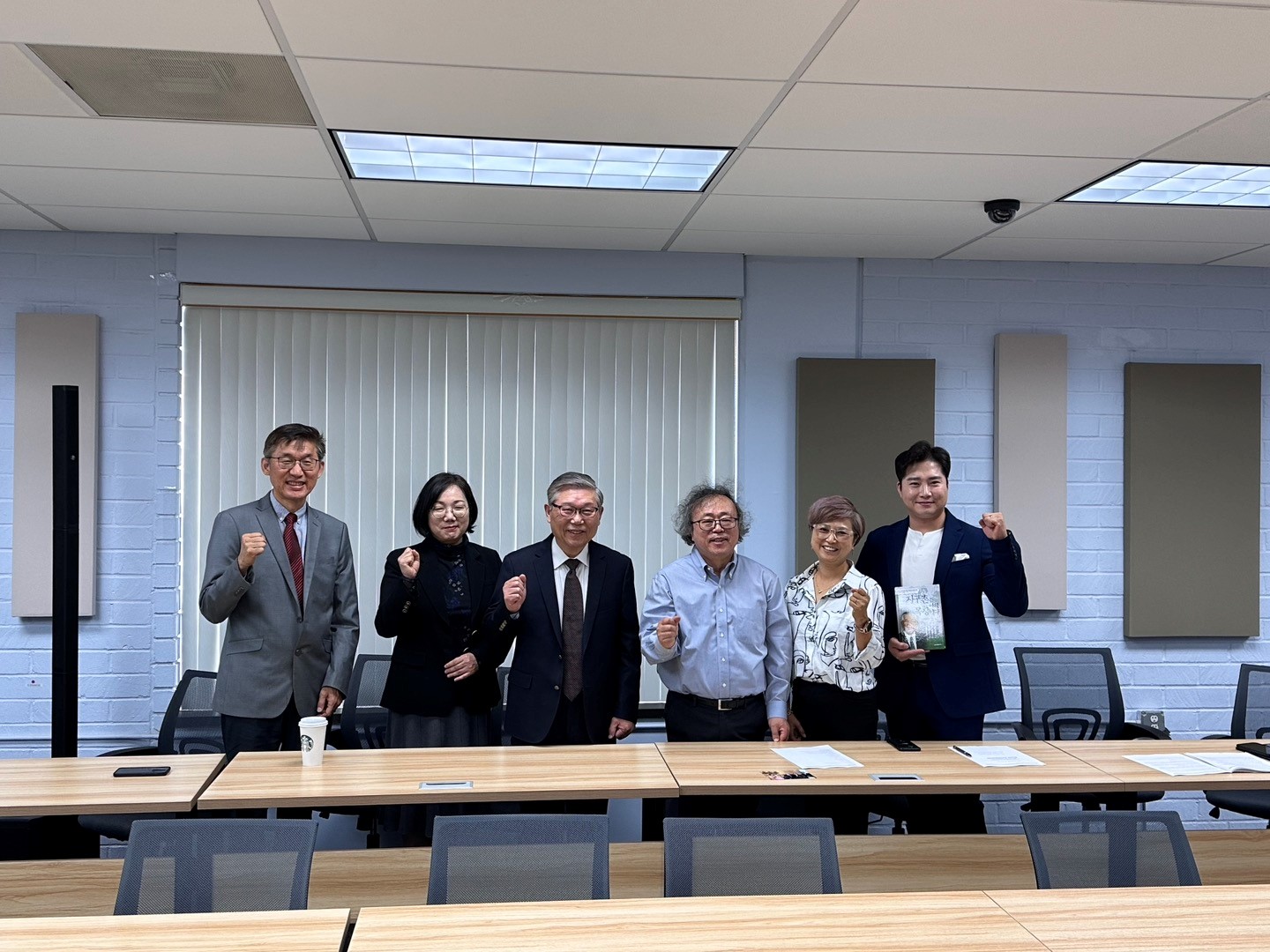 왼쪽부터 신선묵 부총장, 최윤정 교수, 임성진 총장, 윤임상 교수, 클라라 신 감독, 테너 최원현 씨가 기자간담회 후 파이팅을 외치고 있다 (월드미션대학교 제공)