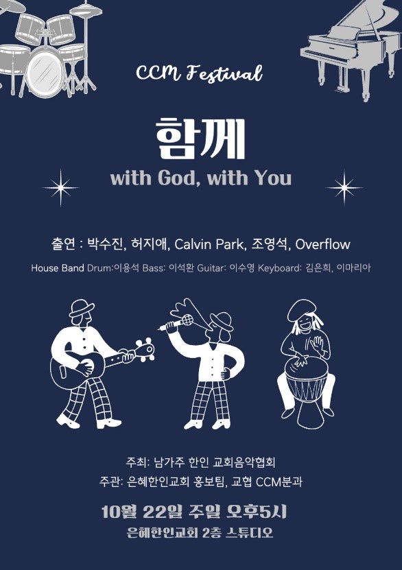 10월22일 주일 오후 5시, 은혜한인교회 2층 스튜디오에서 남가주한인교회음악협회 주최와 은혜한인교회 홍보팀과 교협 CCM분과 주관으로 ‘CCM Festival’을 개최한다고 알려왔다.