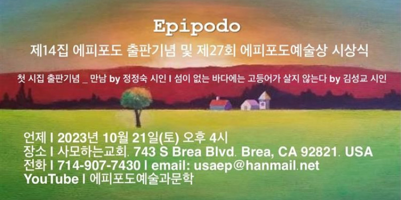 미국 행사는 10월 21일(토), 오후 4시에 브레아 위치한 ‘사모하는교회’에서 개최된다. 아울러 정정숙 시인의 ‘만남’, 김성교 시인의 ‘섬이 없는 바다에는 고등어가 살지 않는다’ 첫 번째 시집 출판기념 축하도 함께 한다.