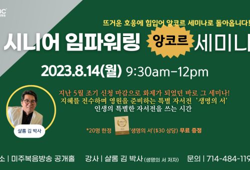 샬롬김 박사의 '시니어 임파워링 세미나' 가 '앙코르 세미나' 로 돌아온다. 지혜를 전수하며 영원을 준비하는 '특별한 자서전' 이야기! 샬롬김 박사의 '시니어 임파워링 세미나' 가 한인성도 및 교회들의 적극적인 참여와 뜨거운 호응에 힘입어 오는 8월 14일 미주복음방송 공개홀에서 '앙코르 세미나' 로 다시 개최된다고 미주복음방소이 밝혔다. 세미나의 강사인 샬롬김 박사는 현재 '비전멘토링인터내셔널' 의 대표로 섬기며, 젊은이부터 노년에 이르기까지 비전 멘토링이라는 제자훈련 방식을 통해 하나님 안에서 소명을 받아 사명을 완수하며 살아갈 수 있도록 돕고 있다. 세미나의 주요 교재인 '생명의 서' 를 통해 시니어들이 각자의 인생과 신앙을 돌아보고 삶의 깨달음을 자녀들에게 전수하며, 죽음 너머의 시간을 준비하는 자서전 쓰는 시간을 가질 수 있다.이번 세미나는, 점점 고령화 되어가는 사회 속에 한인교회의 시니어 사역에 대해 고민하고 있는 교회와 기관들에게 반가운 소식이 되길 기대하며 저자 직강을 통해 교회와 전문 기관에서 활용할 수 있도록 효과적인 사용법을 안내하게 된다. *일시 : 8월 14일(월), 오전 9시 30분 ~ 오후 12시*장소 : 미주복음방송 1층 공개홀 (2641 W. La Palma Ave., Anaheim, CA 92801)*참가대상 : 목회자, 시니어 사역자, 시니어 사역에 관심있는 평신도*참가비 : 무료 (선착순 20명에 한해 세미나 교재인 '생명의 서' ($30 상당) 무료 증정)*문의: 714-484-1190 (미주복음방송)