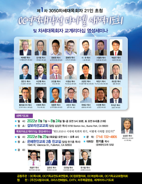 OC지역에서 활동하는 5개 한인 교계단체들이 차세대 한인 목회자 리더십을 발굴하기 위해 힘을 모아 가는 가운데 제2차‘3050 차세대 목 회자 21인 초청 OC영적대각성기도 회를 개최한다.