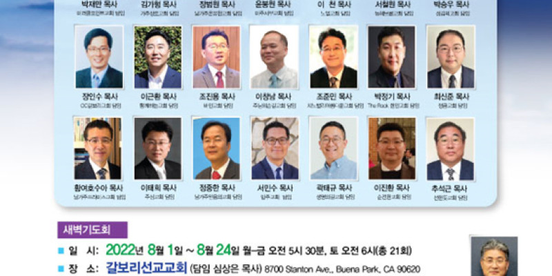 OC지역에서 활동하는 한인 교계 단체들이 힘을 모아 지역에서 21명 의 30~50대 한인 목회자를 선정해 갈보리선교교회(담임 심상은 목사) 에서 진행되는 특별새벽예배 설교 기회를 주고 목회자 간의 교제를 다 시한번 강화 시켜간다는 계획이다.