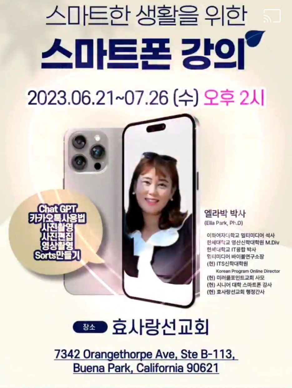 내 손안의 스마트폰 전문강의가 드디어 오렌지카운티에서도 시작된다. 이화여자대학교 멀티미디어 석사와, 한세대 IT융합박사 학위를 소지하고 멀티미디어 바이블연구소장을 역임한 엘라박 박사는 현재 효사랑선교회(대표 김영찬목사)가 운영하는 시니어 대학의 스마트폰 강사로 활약중이다.