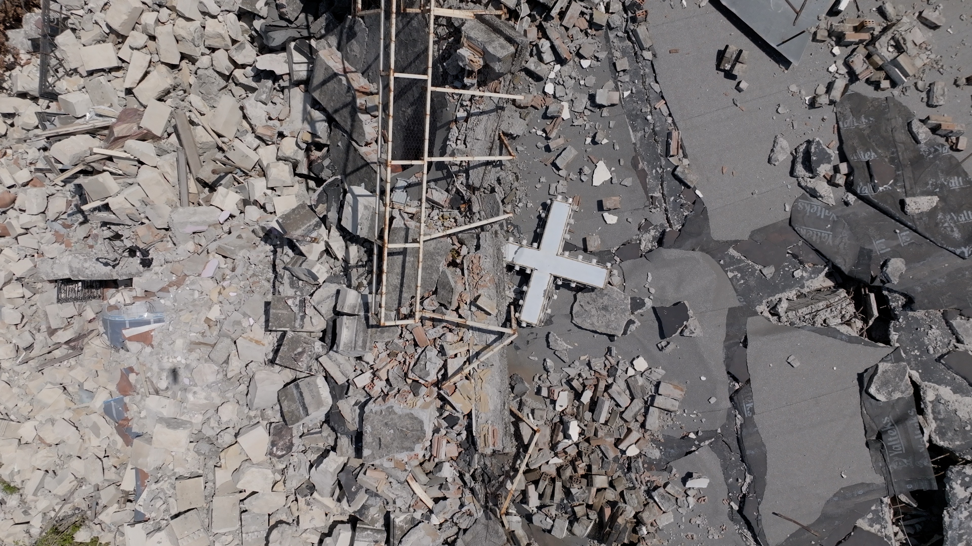 지진으로 처참히 무너진 교회 터. 하얀 십자가가 시멘트 더미에 깔린채 일부 모습을 드러내고 있다. 안디옥지역 개신교회 터