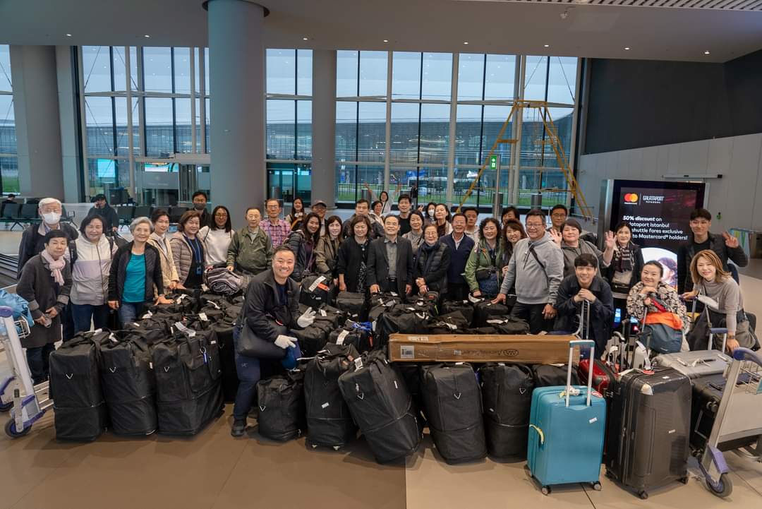 선교사역 중 튀르키예와 시리아 지진피해 지역을 방문하기 위해 대표단이 한기홍목사와 함께 탑승 전 기념촬영을 했다. 구호물자가 가득한 수십개의 이민가방이 주목된다.