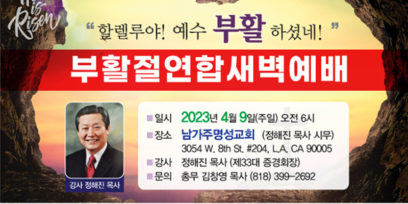 남가주기독교교회협의회(회장 최영봉 목사)가 주최하는 부활절연합새벽기도회가 4월 9일 주일 오전 6시에 남가주명성교회(정해진 목사 시무, 3054 W 8th st. #204)에서 열린다.