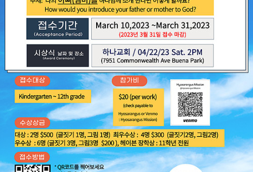 효사랑선교회(대표 김영찬 목사)가 다음세대 청소년들의 자기 정체성과 성경적 가치관을 심어주기 위해 제 10회 '효 글짓기 및 그림 공모전'을 개최한다. 올해 공모전 주제는 '나의 아빠(엄마)를 하나님께 소개한다면 어떻게 할까요? (How would you introduce your father or mother to God?)' 이다. 시상 내역은 대상 2명(글짓기 1명, 그림 1명), 최우수상 4명, 우수상 6명, 헤이븐상 11 학년3명으로 각각 상장과 상금이 수여된다. 참가자 전원에게는 크리스찬 정체성이 분명한 한인 정치인이 시상하게 된다. 남가주 지역 뿐만 아니라 미주 전 지역에서 참가할 수 있으며 특별히 타 주 청소년의 작품이 선정될 경우 상장과 상금도 집으로 우송해 준다. 접수기간은 3월 10일부터 3월 31일까지며, 시상식은 4월 22일 토요일 오후 2시에 진행된다. 참가 대상은 Kindergarten 부터 12학년까지 선착순으로 100명이 참가가 가능하며, 참가비는 1작품에 20달러이다. 청소년들이 쉽게 참여할 수 있도록 온라인 페이지(https://www.hyosarangusa.org) 혹은 QR코드로 온라인 참가신청서에 접속할 수 있다. 작품 제출은 온라인 페이지 (https://www.hyosarangusa.org/) 혹은 우편으로 가능하다. 글짓기의 경우에는 Letter Size, 12pt, PDF Format으로 작성해서 업로드 하면 되며, 그림 참가의 경우에는 Crayon, Watercolor, Acrylic Paint, etc. 의 방법으로 그림을 그린 후 작품 사진을 찍어서 온라인 신청서에 업로드하고 실제 작품은 주소(7342 Orangethorpe Ave #B113, Buena Park, CA 90621)로 우편으로 보내면 된다. 참가문의는 효사랑선교회 전화번호714-670-8004로 연락하면 받을 수 있다. 효사랑 선교회는 매년 특별한 주제로 많은 청소년들이 참여할 수 있도록 독려하고, 공정한 심사를 통해 우수한 작품을 선정해서 시상해 오고 있다. 지난 해에는 코리안 어메리칸으로, 크리스천 정체성이 분명한 정치인이 86명의 모든 참가자를 비롯한 수상자에게 직접 상장을 수여하고, 격려와 축하의 메시지를 전달해 의미를 더했다.