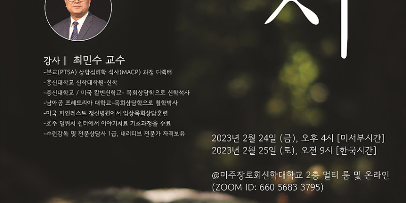 미주장로회신학대학교(총장 이상명)는 상담심리학과 석사과정 주최로 오는 2월 24일 금요일 오후 4시 기획 상담세미나 ‘용서’를 개최한다. 강사는 상담심리학과 석사과정 디렉터인 최민수 교수가 맡았다.