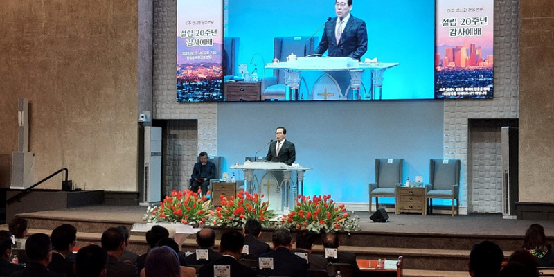 계속된 20주년 감사예배는 공동회장인 기쁜우리교회 김경진목사의 사회로 백은학 장로의 기도, 부이사장인 최순복권사의 빌립보서 1장 3-5절의 성경봉독에 이어 대표회장인 진유철목사가 구원의 능력이라는 주제로 말씀을 선포했다.
