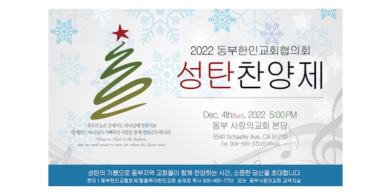 동부한인교회협의회(회장 우영화 목사)는 지난 4일 주일 오후 5시에 동부사랑의교회 본당에서 2022년 성탄연합찬양제를 열고 그리스도의 오심을 찬양하는데 마음을 모았다.