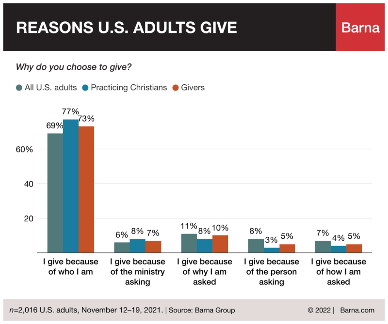 분석된 내용에 의하면 사람들이 자선단체나 기관에 기부하도록 유도하는 경우, 일부 미국 성인들은 요청내용의 본질이 중요한것으로 나타났다. 사람들은 사역내용(6%)이나 혹은 기부를 요청하는 사람이 누구인지(8%)에 따라 기부하며 혹은 기부를 요청하는 이유에 공감(11%)할 경우, 또는 요청하는 방법(7%)따라 기부 여부를 결정한다.